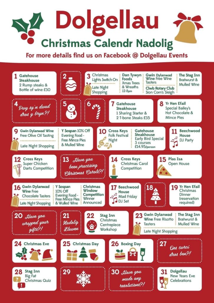 Dolgellau is beginning to buzz in the run up to Christmas. The shops have worked together to produce this little December calendar to give you a taster of events but keep an eye on social media for more that are added.