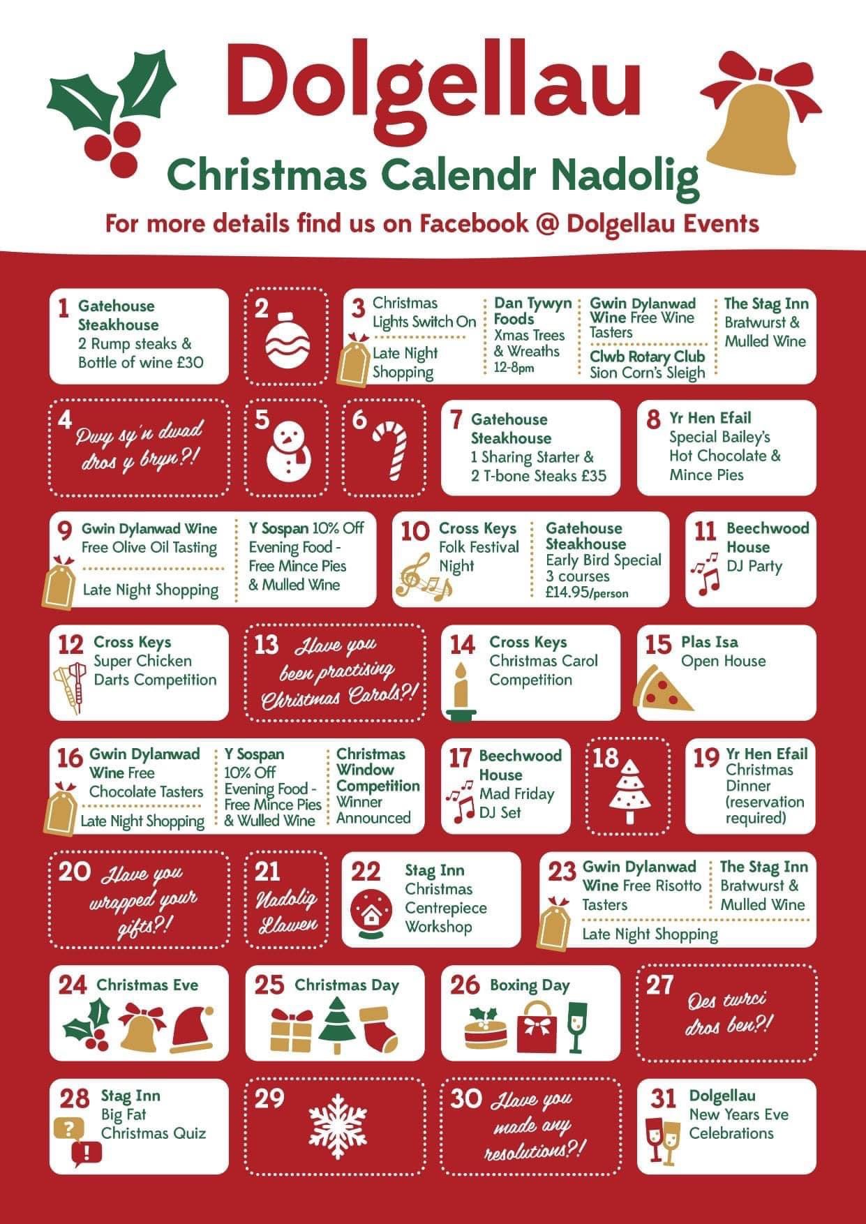 Mae dipyn o symud yn Nolgellau Mis Rhagfyr yma. Trwy gydweithio, mae’r siopau wedi cynhyrchu’r calendr bach yma i chi gael blas o’r digwyddiadau ond cofiwch gadw llygaid ar y cyfryngau cymdeithasol i weld y datblygiadau.